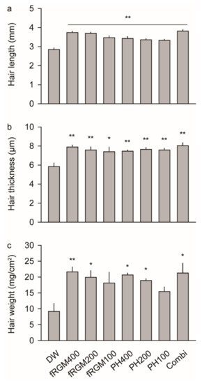 Hair length and thickness were increased in all treatment groups comparing to the DW (Figure 4). There were significant differences among the groups for hair length (F = 15.9; p < 0.01) and thickness (F = 5.2; p < 0.01). Hair length was significantly increased by 1.3-fold in the fRGM400, fRGM200 and combi groups and by 1.2-fold in the fRGM100 and PH groups (p < 0.01). Hair thickness was increased by 1.4-fold in the fRGM400 and combi and 1.3-fold in the other treatment groups (p < 0.05). There were also significant differences among the groups for hair weight (F = 3.7; p < 0.01). The post hoc tests versus the DW group revealed significant increases by 2.4-, 2.2-, 2.3-, 2.1 and 2.3-fold in the fRGM400, fRGM200, PH400, PH200 and combi groups, respectively (p < 0.05). The weights were also increased by 2.0- and 1.7-fold in the fRGM100 and PH100, respectively; however, they were not significant.
