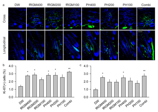 Effects on cellular proliferation. The serial sections were immunostained for Ki-67 as a maker for proliferation (green) and counterstained with 4,6-diamidino-2-phenylindole (blue) (a). Scale bars indicate 100 μm. The immunostained cells were assessed in the cross (b) and longitudinal sections (c) and expressed as a percentage of total follicle cells. Values are mean ± SEM of 6 sample sizes. ** p < 0.01 and * p < 0.05 versus the DW group.
