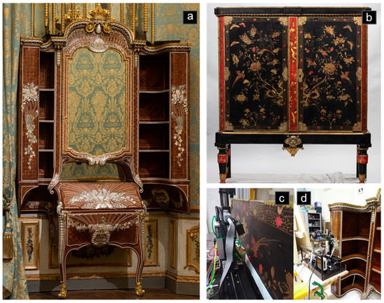 Pictures of the furniture and of the Cultural Heritage Network of the National Institute of Nuclear Physics (INFN-CHNet) macro X-ray fluorescence (MA-XRF) scanner during the measurements: (a) Writing desk Scrivania con scansia by Pietro Piffetti; (b) Chinoiserie wooden cabinet; (c) Scanner placed in front of the chinoiserie wooden cabinet; and (d) in front of the external side of the scansia.