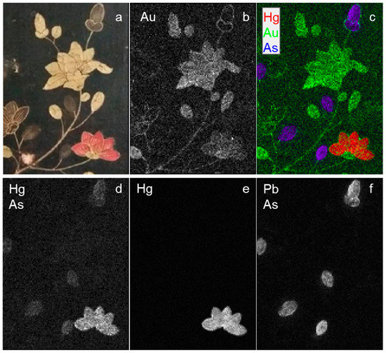 In order to clarify the composition of the different parts of the plant, an RGB map of Hg Lβ (red), Au Lα (green) and As Kα/Pb Lα (blue) transitions has been created and is reported in Figure 2c. As can be seen from Figure 2b, the bright yellow flowers, stems, outlines and highlights over red areas were made with gold. The red flower was likely realised with cinnabar-vermilion, of which the elemental composition is HgS [37].