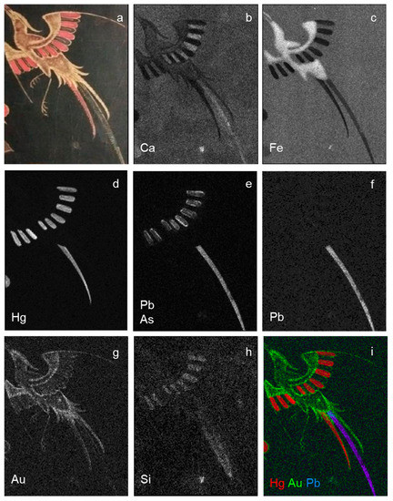 The other area, even though it shows similarities with the previous, presents some essential differences in the decorative palette. The elemental maps of this area are shown in Figure 3. Compared with the area of the plant, the maps of mercury (Figure 3d) and gold (Figure 3g) attest to the probable use, respectively, of cinnabar-vermilion in the red tones, and of gold in the outline of the body and in one of the tails of the bird. The red tail is highlighted in gold as well.