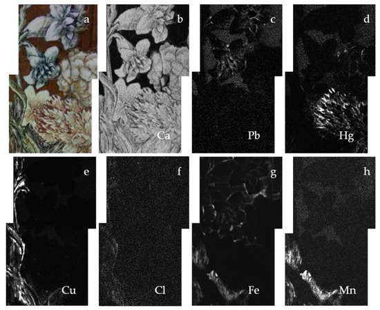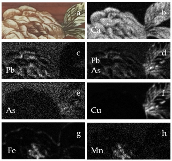 The shading in the central part of the flower is related to the presence of iron (Figure 5g) and manganese (Figure 5h), which may lead to the hypothesis of the use of ochres-earths [39]. In the green leaves, high signals of copper (Figure 5f) and arsenic (Figure 5d,e) are clearly visible. Even though this can be explained by the presence of a copper-based pigment or dye mixed with an arsenic-based compound, the literature suggests that this combination is an unlikely possibility, whereas the green colour may be related to the use of emerald green or Scheele’s green [39,42]. However, it is reported that the latter has only been used since 1814, excluding its use for this piece of furniture; therefore, it is plausible that emerald green was used for the green leaves.