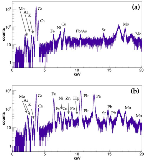 - Vadrucci, M.; Mazzinghi, A.; Sorrentino, B.; Falzone, S.; Gioia, C.; Gioia, P.; Loreti, E.M.; Chiari, M. Characterisation of ancient Roman wall-painting fragments using non-destructive IBA and MA-XRF techniques. X-ray Spectrom. 2020, 49, 668–678. [Google Scholar] [CrossRef]