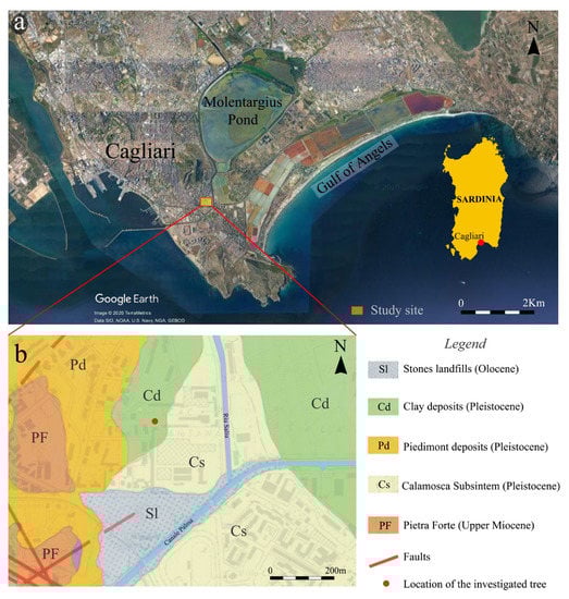 - Barrocu, G.; Crespellani, T. Carta Geologico-Tecnica di Cagliari Scala 1:10000, Facoltà di Ingegneria; Dipartimento di Ingegneria Del Territorio, Università di Cagliari: Cagliari, Italy, 1981. [Google Scholar]