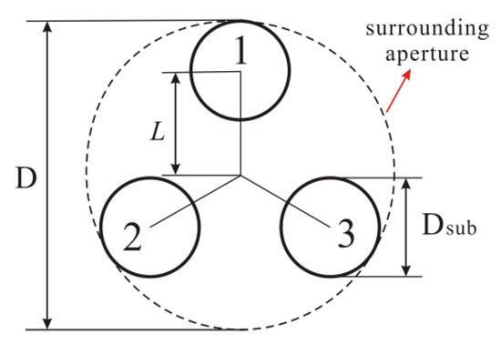where L is the distance between the centers of the surrounding aperture and the sub-mirror. Combining Equations (1)–(3), the relationship between the fill fact F and the angular resolution is obtained:
