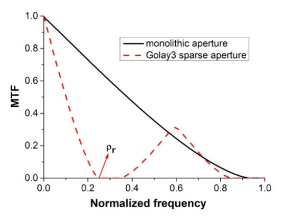 where Dsub and D are the diameters of the sub-mirrors and the surrounding aperture, respectively. For the sparse aperture system, the fill factor F varies from 0 to 1 (i.e., the monolithic aperture), and a larger F allows more light to enter the image plane through the sub-mirrors. Compared with the system with a monolithic primary, the Modulation Transfer Function (MTF) of a sparse aperture system suffers a contrast loss in the mid frequency range as shown in Figure 2, in which ρr denotes the first cutoff frequency. The angular resolution of the Golay3 sparse aperture telescope is given by: