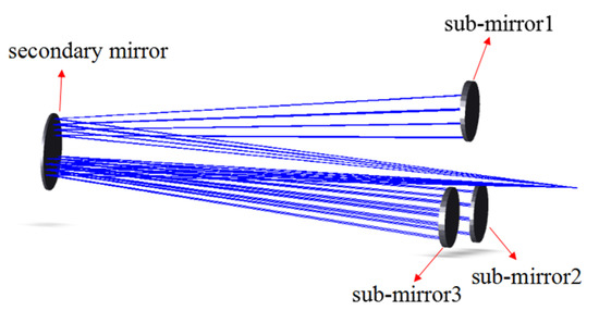 The MIT Adaptive Reconnaissance Golay3 Optical Satellite (ARGOS) demonstrated the practicality of a modular architecture for space-based optical systems for the first time with a FOV of 3–10 arcmins. In 2008, Wang et al. presented a MMT prototype [10] in which the spherical primary mirror consisted of eight annular sub-mirrors and one central mirror. The insertion of a four-element spherical corrector group before the image plane of the prototype achieves a FOV of 0.152°. Compared with conventional spherical and aspheric surfaces (secondary surfaces), free-form surfaces offer higher design freedom, allowing for better optical performance and larger field of view with fewer optical surfaces. However, because free-form surfaces are rotationally asymmetric, the assembly, detection and control of optical systems with free-form surfaces are more complex [11].