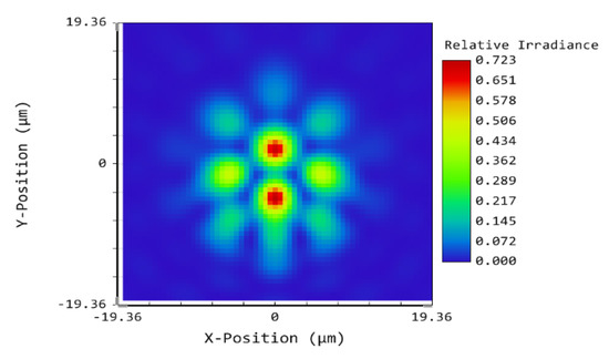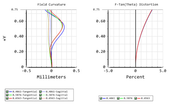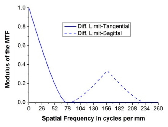 The MTF curves of the Golay3 MMT in Figure 10 indicate that the first cutoff frequency ρr in each field of view is around 80 lp/mm. The MTF values of different orientation in the mid and high frequency region (above 80 lp/mm) are different due to the asymmetry of the sub-mirrors’ distribution. A slight degradation in the sagittal MTF is observed in the mid and high frequency region when going to the outermost fields. The point spread function (PSF) for the most off-axis field is shown in Figure 11 and still delivers a nearly diffraction-limited performance. Though the final system satisfies all the design specifications, it should be noted that the image size is 56.65 mm in diameter, which means that a detector with several hundreds of millions of elements or an array of detectors is needed. From the field curvature curves in Figure 12, the field curvature in the tangential plane is more severe than its sagittal counterpart for the outer FOV (from 0.3° to 0.65°), with a maximum tangential shift of 0.255 mm. The maximum distortion of the Golay3 MMT is 3% for the outermost FOV.