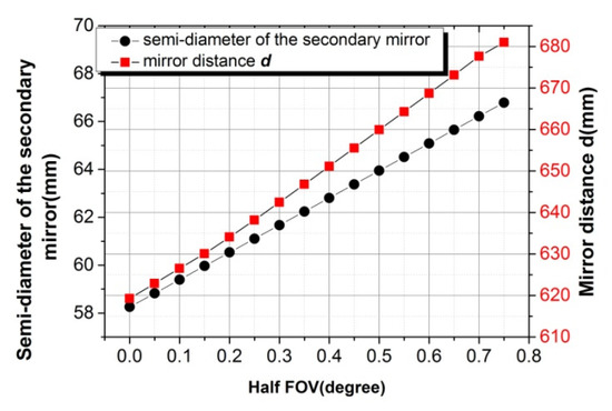 During the optimization process, constraints of a 2100 mm focal length and a secondary mirror with a semi-diameter less than 62 mm are established. It is found that the mirror distance d increases with the increase of the FOV if the diameter of the secondary is fixed (the red solid box in Figure 7).