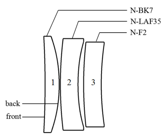 To reduce the chromatic aberration introduced by the corrector group, the refraction index and Abbe number of the three lenses are also set as variables. All the back surfaces of the three lenses are converted to the even aspheric with up to 8th-order terms to further improve image quality. The final configuration of the corrector group is shown in Figure 7 and their parameters are listed in Table 3.