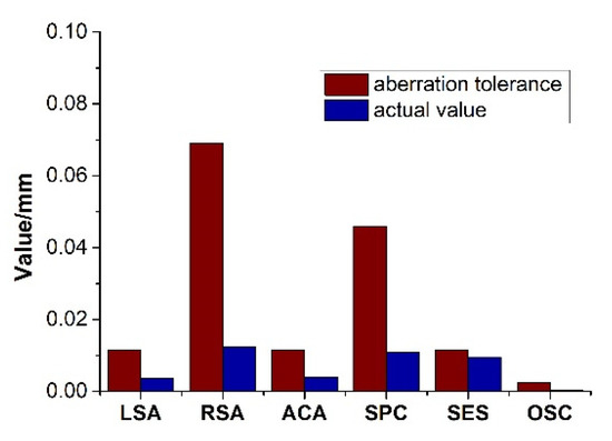 The aberration tolerances of the Golay3 MMT are evaluated by the wavefront error. According to the Rayleigh criteria [13], the performance is almost indistinguishable from perfect if the wavefront error is less than or equal to one-quarter of a wavelength. The tolerances of the geometrical aberrations corresponding to the wavefront error of one-quarter wavelength are calculated and their values are represented by the red bars in Figure 9. Acronyms LSA, RSA, ACA, SPC, SES and OSC represent the longitudinal spherical aberration (λ/n’sin2u’m), residual spherical aberration (6λ/n’sin2u’m), axial chromatic aberration (λ/n’sin2u’m), spherochromatism (4λ/n’sin2u’m), secondary spectrum (λ/n’sin2u’m) and offence against sine condition (usually <0.0025 mm), respectively. The parameter n’ refers to the refraction index in the image space, and um’ is the angle of the marginal ray in the image plane. These geometrical aberrations can be calculated by ray tracing and their values are represented by the blue bars in Figure 9. As can be seen from Figure 10, the values of the five geometrical aberrations are far less than their corresponding aberration tolerances.