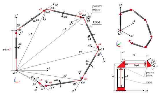 Relations describing the position kinematics by means of position vectors pi, where iϵ<1;7> at individual open kinematic chain segments have also been derived in [25,26]. This is the case of the robotic arm’s forward kinematics. The relations serve the purpose of calculating the position of a point that would enable the attachment of either an effector or another device. Thus, the position of a point [pxi, pyi, pzi] on the module will be defined by the function of the rotation positions φi, ϑi and the segment size of the structure at hand—|ri|; pi = f(φi, ϑi, ri). The basis of the arm [1,2] is an autonomous, cylinder-shaped module. Such modules have a single degree of freedom, namely the rotational one. The rotation happens around the module’s main axis and is not limited in the interval under consideration ranging from 0 to 360 degrees. The rotation may occur continuously in either direction of rotation without limitation. The modules and joints are contemplated to be perfectly solid bodies. The individual modules’ axes of rotation cross each other at the point where they are joined by passive joints, Figure 1. The distances of section points in space are quantified by the ri vector (a kinematic chain segment), and this vector has its own Cartesian system of Si{Oi, xi, yi, zi}. The segment’s rotation around the zi axis is defined by the rotation matrix Rzi(φi) [3,4,5]. The segment’s rotation around the yi axis is defined by the rotation matrix Ryi(ϑi).