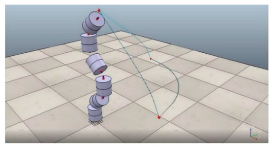 An open kinematic chain model was created in CoppeliaSim Edu, in Figure 2, composed of modules featuring 6 degrees of freedom.