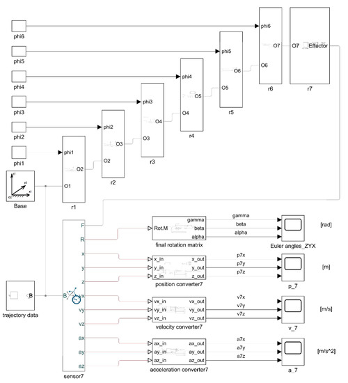 The model is composed of individual blocks that define its parts. In a nutshell, the model consists of a base identical to the “base” of the reference system and the individual blocks representing the ri vector (a kinematic chain segment). As we can see in Figure 1, the “vector r I” block then consists of the “URM“ module and a passive joint part. The modules are connected in places where each joint represents its own Cartesian system of the module, starting in point Oi. In this experiment, the last part of the passive joint, vector r7, was considered to be an effector. A measuring device (sensor 7) is connected to the effector r7, checking physical quantities (position, velocity, acceleration). Such measuring devices can be mounted on other modules, too. The Euler’s angles’ values are also available in three consecutive rotations around the axes, often marked ZYX. The values apply to the effector and are the result of the final product of the individual spatial transformations (8), as is usually the case with the open kinematic chain [27]. A model constructed in this way is then visualized in the Mechanics explorer window and appears in the form as seen in Figure 4.