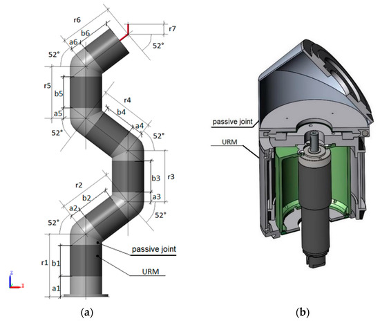 (a) Model visualization with hints of dimensions in Matlab-Simulink using the Simscape/Multibody toolbox. (b) Detail URM with a passive joint.