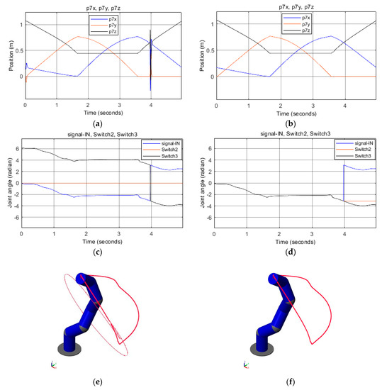 Illustration of the p7 = [p7x, p7y, p7z]T position vector (effector) depending on the joint coordinate vector φ = [φ1, φ2, φ3, φ4, φ5, φ6]T and its effect on the trajectory: (a) before repolarization; (b) after repolarization; the value of the joint coordinate vector depending on time φ = [φ1, φ2, φ3, φ4, φ5, φ6]T; (c) before repolarization; (d) after repolarization; effect on the trajectory; (e) before repolarization; (f) after repolarization.