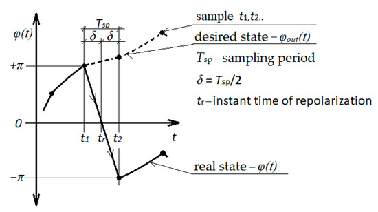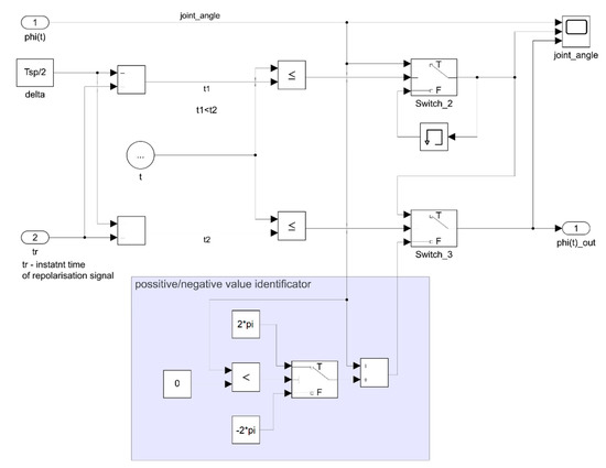 When the data were uploaded, it was first necessary to establish the moment of repolarization tr with the precision of δ = +/−0.0025 s when the variable φ(t) = 0, i.e., cuts through the time axis. Under the assumption of reaching the upper or the lower working interval limit <−π, +π> of the joint coordinate. The variable at the output from the repolarize is φout(t). It was necessary to meet the following conditions: