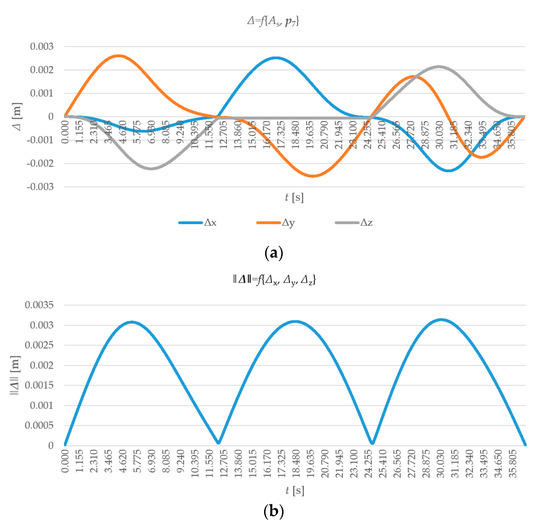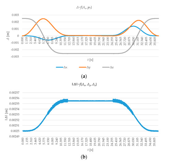 (a) The chart showing the difference Δx, Δy, Δz between the real trajectory (composed of the As{xAs, yAs, zAs} points) and the one calculated (from the components of the position vector effector p7x, p7y, p7z) in Matlab; (b) norm (size) of the vector ‖Δ‖.