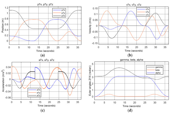 Effector values measured in Matlab: (a) position vector p7 = [p7x, p7y, p7z]T depending on the joint coordinate vector φ(t); (b) velocity vector v7 = [v7x, v7y, v7z]T depending on the joint coordinate vector φ′(t); (c) acceleration vector a7 = [a7x, a7y, a7z]T depending on the joint coordinate vector φ″(t) and (φ′(t))2; (d) Euler’s angles (γ, β, α) depending on the joint coordinate vector φ(t).