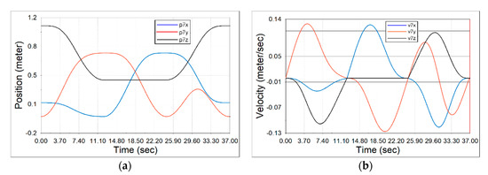 Effector values generated in SolidWorks: (a) position vector p7 = [p7x, p7y, p7z]T depending on the joints coordinate vector φ(t); (b) velocity vector v7 = [v7x, v7y, v7z]T depending on the joints coordinate vector φ′(t).
