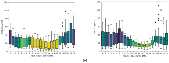 According to recently published studies, similar findings were identified in several cities in various parts of the world [22]. In the first month of lockdown, period 15 March–15 April 2020, the official heating session was still ongoing. For the most part, mean daily temperatures in the week before and in the first weeks of lockdown, during which the sampling campaign was conducted, were below 10 °C. Residential heating sources caused higher concentration in the morning and during the night at almost all sampling sites and can be clearly recognized from the boxplot representing 1 h variations in the week before the EMS and period at the EMS beginning (Figure 5).