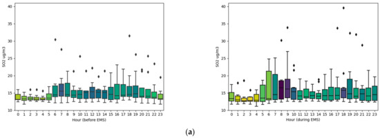- Daily profiles of SO2, the main pollutant, depicted in the form of a boxplot (Figure A5a), show that, on average, there is a slight change a week before and 10 days during the emergency state. In the week before, for most hours of day, SO2 concentration was approximately 5 μg/m3, while in the first 10 days of the emergency state, the median is a bit higher between 7 and 8 μg/m3 from midnight to morning hours and about 10 μg/m3 later on during the working hours and evening.