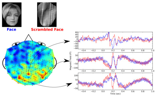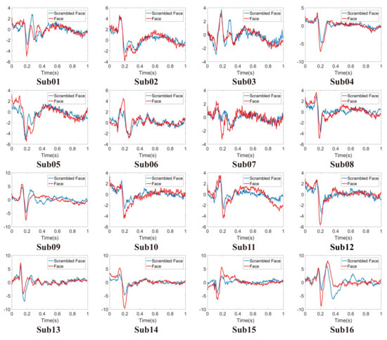 According to the spatial feature in Figure 6, the MEG channel with largest weight of each subject can be determined. To some certain extent, the signals at this channel can be considered as typical MEG signals for the decoding experiments. By averaging the MEG signals at the highest-weighted channel, the typical MEG waveforms evoked by face or scrambled face image stimulation are obtained. As shown in Figure 7, the typical MEG waveforms evoked by the two different stimulations are presented. From the figure, we can find that the waveforms evoked by face and scrambled face images were quite different at about s. The waveforms corresponding to face image stimulation usually had lower amplitude at about s according to the previous studies [4,13,14].