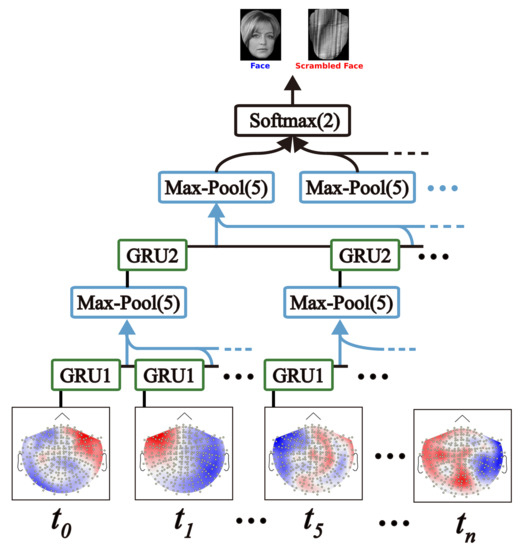 Based on the GRU structure, the proposed HGRN is built to adaptively capture the dependencies of MEG signals in different time scales. In Figure 3, the structure of the proposed HGRN is shown. The proposed HGRN consists of two GRU-based layers, two down-sampling layers and an output layer. In the GRU-based layers, there are two GRUs, the GRU1 and GRU2 layer. Located in two different layers, GRU1 and GRU2 consist of 100 and 10 output units, respectively. The GRU layers are able to extract spatial features at the current time point and the previous ones. Compared with the other kinds of network structures, the HGRN model with GRU layer can efficiently process spatial-temporal data with a simple structure. In the down-sampling layers, max pooling (Max-Pool) operation is applied [33]. The Max-Pool(5) indicates that the max activation value at 5 contiguous time points is considered as the sampled value. Then the temporal features within 20 ms and 100 ms scale can be extracted by the first and second max pooling layers. Moreover, the output layer of HGRN is a fully connected layer with two output units. The spatial and temporal features can be combined to achieve better MEG decoding performance. Similar to many other deep networks, the HGRN applies softmax function for the activations of its output units. Then, the outputs of HGRN can be obtained that the visual stimulation of the current input MEG signal is predicted.