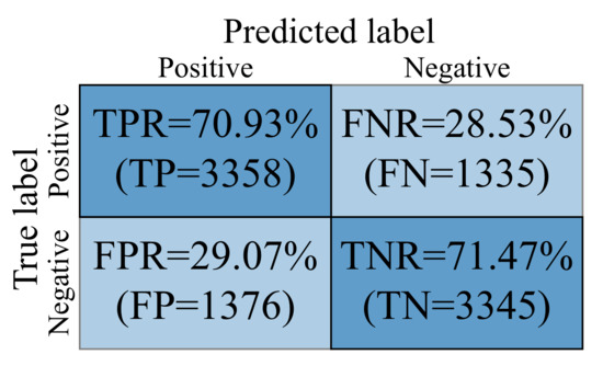 As shown in Figure 4, the number of samples in the categories of true positive, true negative, false positive and false negative are presented in the confusion matrix. Moreover, the corresponding TPR, TNR, FPR and FNR are also presented. According to Figure 4, the TPR and TNR were closed to . The corresponding recall, precision and F1 scores are , and , respectively. These results demonstrated that the HGRN model can evenly distinguish the positive samples and negative samples (i.e., MEG signals evoked by face images and scrambled face images). The accuracy is a proper metric to evaluate balance datasets according to the previous study [37]. In the used dataset, the number of the positive and negative samples are 4693 and 4721 that it can be considered as a balance dataset. The accuracies presented in Table 1 can be used for the comparison between the performance of the other models and ours. In addition, about 30 percent of samples were incorrectly categorized. That is to say, there was still a lot of room for improving MEG decoding performance.