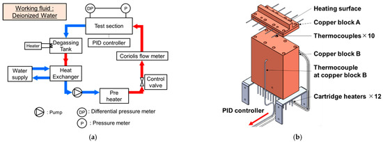 A schematic diagram of the experimental apparatus is shown in Figure 1a. Deionized water was used as the working fluid, and a degassing tank with a capacity of 40 L was used to store the water. A heat exchanger was installed just after the degassing tank to reduce the working fluid temperature. After around 2 h of degassing, a magnetic pump “IWAKI” was activated to provide the water flow. The mass flow was measured using an Oval Coriolis flowmeter and regulated with a control valve. The heating section is shown in Figure 1b. Copper block A and copper block B were assembled, cartridge heaters were used to heat copper block B, and one K-type thermocouple was inserted on copper block B to measure the temperature. A detailed explanation of the test section is given in the next section. The temperature of copper block A was controlled by a proportional integral derivate (PID) controller; thus, the test section was set to the desired heat flux and wall superheat. The copper block temperature was set from 120 °C and increased in steps of 40 °C. When the copper block reached 600 °C the experiment was stopped to avoid damages to the experimental equipment; in particular, the copper block. The upper part of the test section was covered by a polycarbonate lid, and the flow aspect was observed and recorded using a fast speed camera “Fastcam mini AX50” under 5000 fps and a shutter speed of 1/50,000. In the present experiments, the porous thickness, mass flux, and inlet subcooling were used as the parameters, as shown in Table 1, and each effect was discussed.