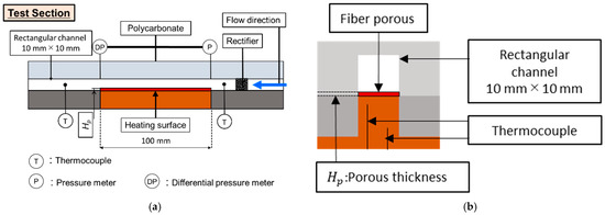 A uniform temperature field was created for the working fluid when it passed through the aluminum rectifier installed in the inlet part of the test section and then it flowed into the heating section as shown in Figure 2a. The pressure and temperature were measured in the inlet and outlet parts of the heating section. The physical properties of the working fluid were calculated using the software Refprop ver. 9.1 [28]. The channel was a square of 10 mm × 10 mm and the length of the heating section was 100 mm. As shown in Figure 2b, the heating surface was located on the lower part of the flow channel and covered by the polycarbonate to avoid heat loss.