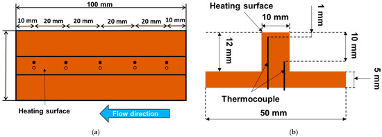 Figure 3a shows a top view of copper block A, which had a heat transfer surface of 10 mm × 100 mm. Ten thermocouples were divided into five groups of two thermocouples, and each group was inserted into copper block A. The five groups were located at (10, 30, 50, 70, and 90 mm) in the flow direction from the inlet part of the heating surface, respectively. Figure 3b shows the distribution of each pair of thermocouples; the distance between them was 9 mm, and the distances to the heating surface were 1 and 10 mm, respectively.