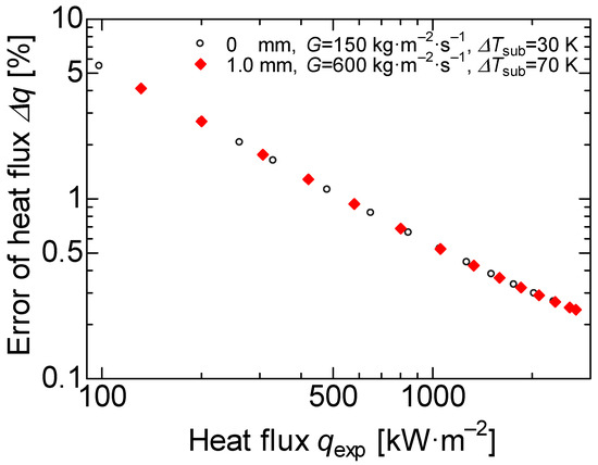 In Figure 5, the errors of each heat flux are plotted for 0 and 1 mm thickness heat transfer surfaces in comparison with the experimental results. The heat flux error was about 3% at the 200 kW·m−2; however, the heat flux error was less than 1% at a heat flux higher than 500 kW·m−2.