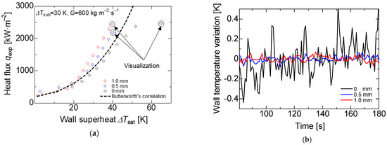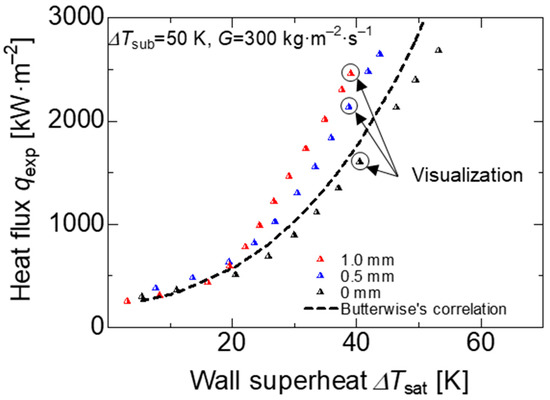 Figure 8 shows the boiling curve of the bare and porous surface at a subcooled temperature of 50 K and mass flux of 300 kg·m−2·s−1. We found that was no significant difference between porous and bare surfaces in the region where forced convection heat transfer was dominant; however, around = 20 K, where the bubble formation became intense and nucleate boiling heat transfer became dominant, the heat flux of the porous surface was improved in comparison to the bare surface at the same wall superheat degree. In addition, Figure 8 shows the heat flux at the same wall superheat, and the heat flux increased at higher porous thickness. The heat flux on porous surfaces with a thickness of 1 and 0.5 mm increased by 60% and 40%, respectively, compared to the bare surface at = 40 K. For the same heat flux at q = 1000 kW·m−2, the wall superheat was reduced to around 5 and 10 K for the 0.5 and 1 mm porous thickness, respectively, in comparison with the bare surface.
