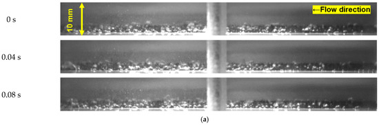 Figure 9 shows the subcooled flow boiling pattern of each heat transfer surface at a wall superheat of 40 K. As the thickness of the porous body increased, the amount and volume of the bubbles also increased. The bubbles were generated only on the surface of the heat transfer surface and quickly condensed on the case of bare surface 9a; however, the size of the bubbles increased and reached the middle of the channel at the 0.5 mm porous surface. In addition, bubbles reached the top of the channel on the 1 mm porous surface. This may be due to the increase in the number of cavities in the porous fibers, which results in nucleation boiling in more locations. We considered that the porous heat transfer surface showed high heat flux at the same wall heating degree, and the increase in the wall superheat was suppressed at the same heat flux.