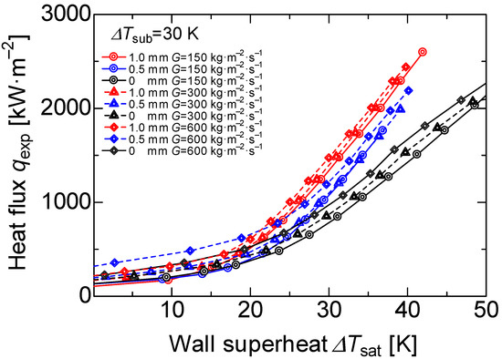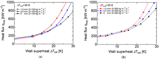 The enlarged boiling curve at mass flux G = 150 kg·m−2·s−1 is shown in Figure 11a. We found that there was a small variation in the heat flux when the wall superheat was 10 K or lower; however, the porous surfaces with 1.0 and 0.5 mm deviated from the slope of the forced convection at around 13 and 16 K, respectively. In other words, the wall superheat degree decreased as the porous body thickness increased. Figure 11b shows the boiling curve at the mass flux of 300 kg·m−2·s−1 where the deviation from the convection slope was around 15 and 18 K for the 1 and 0.5 mm porous thicknesses, respectively. The reason is attributed to the development of the thermal boundary layer. There are three main reasons for the difficulty in developing a thermal boundary layer. First is the turbulence effect caused by the porous body. This porous surface is installed on the bare surface, and it leads to stirring the working fluid near the heating surface. Second is the expanding heat transfer area. The porous metal is sintered to the heating surface as the same material, and the heat is easily transferred from the heating surface to the working fluid. Third is turbulence promotion by the bubbles. This porous surface has a higher number of cavity sites; thus, the generation and the evaporation of bubbles also increases. We considered that these effects cause turbulence in the thermal boundary layer compared to the bare heat-transfer surface and, therefore, the heat transfer is enhanced even at a low wall superheat.