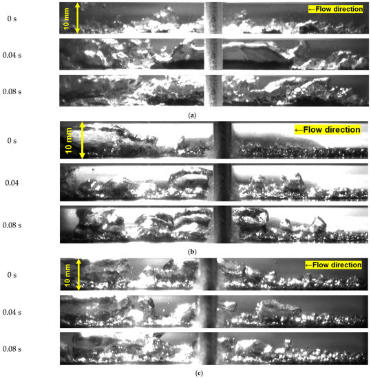 In addition, the wall temperature variations concerning the time are shown in Figure 12b. The variation on the bare surface wall temperature degree was between −0.4 and 0.4 K. However, for the porous surface case, the variation was barely 0.1 K. The bare surface reached the CHF, and the film boiling was observed on the heated wall, as shown in Figure 13a. Contrarily, using the high-porosity sintered porous metal, the CHF was not reached and the wall superheat stayed below the 40 K. The flow patterns are shown in Figure 13b,c for the 0.5 and 1 mm porous surfaces, respectively. On the porous surface, the burn out did not occur due to the constant water supply prompted by the bubble formation and the bubble departure rate was higher on the porous surfaces.
