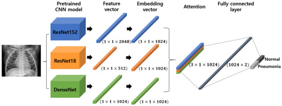 It is widely known that as the model gets deeper, the number of parameters increases. Thus, the flexibility of the model increases and the training error decreases. However, the generalization error increases due to over-fitting to the test data. Sufficient data are needed for the model to classify pneumonia and normal. Distinguishing between normal organs and pathological signs requires medical professionals that have the relevant knowledge. Therefore, large medical datasets with correct answer labels are expensive. To solve this problem, we used three pre-trained models from different domains (ImageNet, Chest X-ray14, Custom dataset). DenseNet121 was trained to predict 14 anomalies including pneumonia on chest X-ray images. Among the above pre-trained models, it was confirmed that using the model based on DenseNet121 had the highest accuracy. The domain of the test dataset is similar to that of the chest X-ray14 data set. When combining the models with an attention mechanism, it means that the final model will also show good performance if the combined transfer learning model is pre-trained with data from a domain similar to the domain of the target task. The test data for this paper was 5,856 images, which is insufficient to train a model that used over a million images such as ResNet and DenseNet. With data preprocessing, our model can train with low-quality input images and reach good performance. However, good quality input images as input can improve the performance of our model. There are limitations where there may not be a pre-trained model using data from domains similar to our target task. In this case, it is expected that the performance can be improved either by using pre-trained models trained on various datasets, or by using more models. Future work on our study will add a study related to domain adaptation that can achieve domain changes by maintaining high performance in the original domain. We will also have to study how many pre-trained models are desirable to use. Our framework is not the only one used to diagnose pneumonia. Simply, our framework is to look at chest X-rays and classify them as pneumonia or normal with the hope that it could be used as an aid to medical expert diagnosis. At the same time, our framework is expected to add credibility to the diagnosis of pneumonia.
