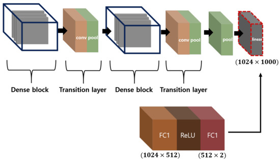While ResNet [10] is a way to proceed by adding the previous information, DenseNet [11] is a way to stack all the parts that have been passed through while learning. In order to maximize the information flow between layers of the network, each of the layers with the same feature map size are directly connected. DenseNet (shown in Figure 3) is a structure in which all layers are connected in a feed-forward manner. The convolution layer of each DenseBlock is concatenated with the outputs of all previous convolution layers. This concatenated feature map is passed to the convolutional operation. The feature map of the previous layer is continuously connected with the input of the next layer, and the connection is a method of concatenation rather than addition of the feature maps. Each layer receives an additional input from all previous layers and it delivers the current feature map to the next layer to maintain the feed-forward feature. DenseNet compensates for the loss of initial information as the layer deepens, and each layer directly approaches the gradient obtained from the loss function and input, making learning easier. Additionally, filters are more densely located on each layer than in other models, which efficiently take information and reduce the number of parameters. However, the deeper the layer, the more computational power required. We use the weights of pre-trained DenseNet, but we redefine the dimension of the last fully connected layer of DenseNet121 to fit the number of our classification classes.