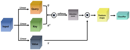 Previous convolution operations have a problem in identifying relationships with pixels in distant locations. Each of the features is only contained in certain local fields. Self-Attention [31] was proposed to overcome these problems. The computation of Self-Attention is similar to that of convolution operations but it is easy to identify relationships with remote regions. Figure 5 gives a visual representation of Self-Attention. Given an input, it is divided into Query, Key and Value of the identical shape as . These mean batch size, query length, and model dimension in that order. Here, we use Multi-Head-Attention that performs Self-Attention from several perspectives. First, we get the mapped score from the convolution operation of query and key, and then pass that score to the soft-max layer. . The output of the attention operation is the convolution operation of the Score and Value . Classification is performed in a fully connected layer using the final output of Self-Attention.