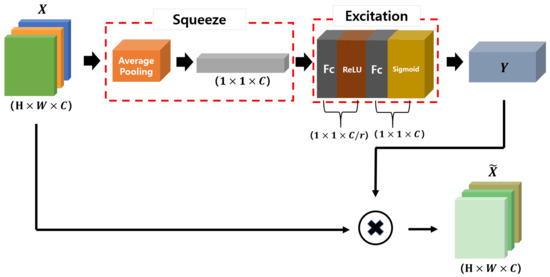 SENet [20] uses the interdependency between the channels to improve the quality of the generated feature representation by the network. The goal of SENet is to recalibrate the features that were obtained through the convolution process with the importance per channel. SENet uses channel-based attention to selectively adjust the weights of CNN channels. SENet improves the performance of the CNN model by attaching SE blocks after the convolution operation. This model consists of two parts, squeeze and excitation. The squeeze operation compresses the entire information to embed global information. Excitation operation scales the importance of each feature map. In this step, the squeezed important information is recalibrated. (shown in Figure 6) These two parts are tied together and called SE blocks. The first step is a simple convolution operation that converts the dimension of to . It converts two-dimensions of feature maps of C channels into -sized C feature maps. Using a Global Average Pooling(GAP), each two-dimensional feature map is averaged to one value. It compress the global information from each channel. This operation was referred in Equation (1), where represents the output of the convolutional operation with c filters. In , i and j are the mean indices of H and W, respectively