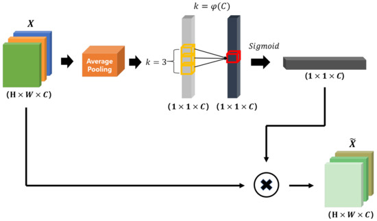 Previous CNN models have greatly improved their performance by using the self-attention mechanism. However, the complexity of the model is too high. SENet computes weights using two FC layers. Through two fully-connected layers, dimension reduction is performed to reduce the amount of computation. Important features are highlighted via non-linear activation functions. In ECA [21], the channel weight is obtained by performing channel attention without dimensionality reduction using 1D convolution of kernel size k instead of two FC layers (shown in Figure 7) Model complexity is reduced by a filter that considers only the surrounding local area with 1D convolution. ECA improves the balance between performance and complexity. Kernel size k is determined by cross-channel interaction through the channel dimension C function. Considering that the function between k and C is and channel dimension C is generally set as a multiple of 2, it can be set as a non-linear function such as This function can be expressed in terms of k (shown in Equation (4)). ECA modules are applied to CNN models by replacing existing SE blocks.