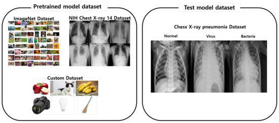 For the training, we employed three different domains of datasets. We employed the structure of pre-trained models that were each trained on ImageNet [15], Chest X-ray14 [28], Custom datasets [29]. The ImageNet dataset is well known for being easily accessible and large. It contains 1,281,167 data classified as 1000 classes. The Chest X-ray 14 dataset is the largest publicly available chest X-ray dataset released by the National Institute Of Health(NIH). It contains 112,120 X-ray images of 30,805 patients and classified into 14 chest pathology labels, including pneumonia. The Chest X-ray 14 dataset has a similar domain as our test dataset. The Custom dataset is classified into 11 classes and contains a total of 43,956 images. This dataset was used to demonstrate the generalization ability of our framework. With our framework, even pretrained models in unrelated domains can also be used to implement the target task. For the testing, we used publicly available chest X-ray images collected from pediatric patients between 1 to 5 years old from Guangzhou Women and Children’s medical center [32], which was not used for the pre-trained model. This dataset was collected by researchers that have achieved approvals from the Institutional Review Board (IRB) and Ethics Committee on data collection and experimentation. The dataset consists of 1583 normal images and 4273 pneumonia images. Of the 5856 images, 5216 images are used for framework training, and 16 images are used as data to evaluate models during training. The size of the validation set was too small, so it was used for reference only, and cross-validation was not performed separately. Cross-validation is used to avoid overfitting. However, this process takes a lot of time. So, we chose not to use the cross-validation procedure. Instead of cross-validation, we used the validation set to determine the optimal number of epochs to avoid overfitting. Finally, 624 images were used to conduct tests on the framework (shown in Table 1). Pneumonia is divided into bacterial and viral pneumonia. However, we focus on the binary classification task of classifying normal and pneumonia by defining two pneumonia categories as one pneumonia category due to lack of data. Images of the normal class are much smaller than images of the pneumonia class. We used F-score to evaluate our approach properly given the class-imbalanced dataset. Although we used a class-imbalanced dataset, there was no major problem with model performance. A sample image of the dataset is shown in Figure 8.