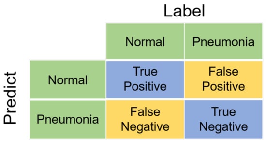 The primary goal of our approach is to improve the accuracy of pneumonia diagnosis using chest X-ray images. We prepared three types of pre-trained models based on a different domain to check the generalization of our framework. Feature vectors were extracted using the backbone structures of pre-trained ResNet152, DenseNet121, ResNet18 to confirm the performance of the classification of pneumonia and normal. Each dimension of the feature vector of the model is 2048, 1024, 512. To verify our framework, we concatenate each feature vector with the same 1024 embedding dimensions. We applied three types of attention mechanisms, Self-Attention, SE, ECA. The proposed approach has been trained on 5216 images from Guangzhou Women and Children’s medical center, while the rest of the 624 images were used for testing the performance of the model. We redefined the final layer of each of the pre-trained models with a new classifier suitable for classifying pneumonia and normal images. For the experiment, we implemented the Adam optimizer [33] and the NLL (Negative Log-Likelihood) loss function. The learning rate started at 0.0001 and was reduced by after every 10 epochs. The epoch represents the number of training sessions for training the datasets. The computations in the neural network are divided into forward pass, which goes through the calculation process of each layer’s weight from input to output, and backward pass, which goes back to the calculation process and modifies the weight. Once the two processes are completed, one epoch was performed. All models were trained within 30 epochs. The results from each model are shown in Table 2. We used Recall, Precision, Area Under the Curve(AUC), and Test Accuracy as our evaluation metrics. The following can be obtained by calculating the Recall and Precision by referring to Figure 9 and Equation (5).There are a total of four possible outcomes from the binary classification we performed. It is divided into True Positive(TP), True Negative(TN), False Positive(FP), False Negative(FN). True and False means whether the model was correctly or incorrectly predicted. The prediction of normal by the model means Positive, while predicting pneumonia means Negative.