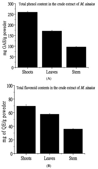 The MeOH extract of the shoots of M. sinaica exhibited the highest total phenolic content (259.7 ± 0.57 mg GAE/g powder), followed by the MeOH extract of leaves (171.2 ± 1.68 mg GAE/g powder). On the other hand, crude extract from the stem exhibited the lowest total phenolic content (96.5 ± 2.98 mg GAE/g powder) (Figure 1A). Similarly, crude extracts of the shoots and leaves exhibited the highest total flavonoid content (69.5 ± 1.07 mg and 57.7 ± 0.57 mg QE/g powder, respectively), while crude extract from the stem exhibited the lowest total flavonoid content (Figure 1B).