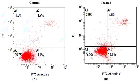 MDA-MB-231 cells were treated with sub-IC50 concentrations (14 μg/mL) of MeOH extracts shoots. These cells demonstrated increased Annexin-V FITC/PI-staining as compared to mock (methanol, 0.55% v/v)-treated control cells (Figure 2). The percentage of early and late apoptotic cells upon treatment were increased to 13 ± 0.5% and 5.6 ± 0.3%, respectively, upon treatment, as compared to controls (1.1 ± 0.2% and 1.7% ± 0.3%, respectively), in mock-treated control cells (Figure 2).