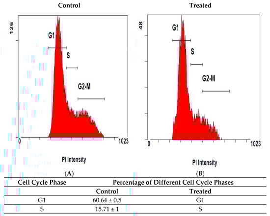 MDA-MB231 cells were treated as described above in Section 2.5, and both treated and control cells were washed with PBS and harvested by scraping. The cells were pelleted by centrifugation at 2000 rpm for 5 min and washed twice with PB and fixed in 70% cold ethanol. The cells were stained with PI solution (50 µg/mL) for 30 min at 37 °C in the dark. The stained cells were analyzed using a Beckman coulter LS600 flow cytometer.