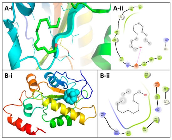 Molecular docking (A-i). The mode of interaction of compound 2-tridecen-1-ol in the ac-tive region of CDC25B (A-ii). The ligand 2-tridecen-1-ol (green colored) (B-i) and the important residues in the active site of the enzyme are presented by a tube model (B-ii).