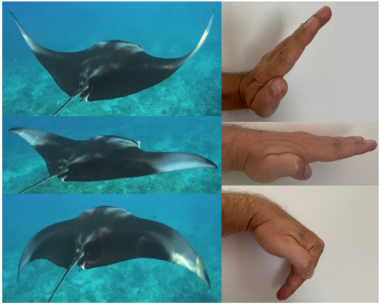 The innovative character of the hand joints rehabilitation equipment is given by the bioinspired concept of the hand support and its actuation. The system supporting the patient’s hand within the equipment was conceived consequently to observing the similarity of the stabilizing and propulsion motions of manta ray fins and the flexion/extension motions of the hand (Figure 4).