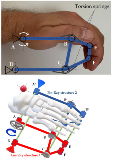 Figure 6 shows the diagram of principle of the hand joints. For the palm to be placed comfortably on the equipment, the entire structure includes two identical Fin-Ray type structures arranged in parallel and linked rigidly one to another by means of distancing bar elements (Fin-Ray structures 1 and 2).